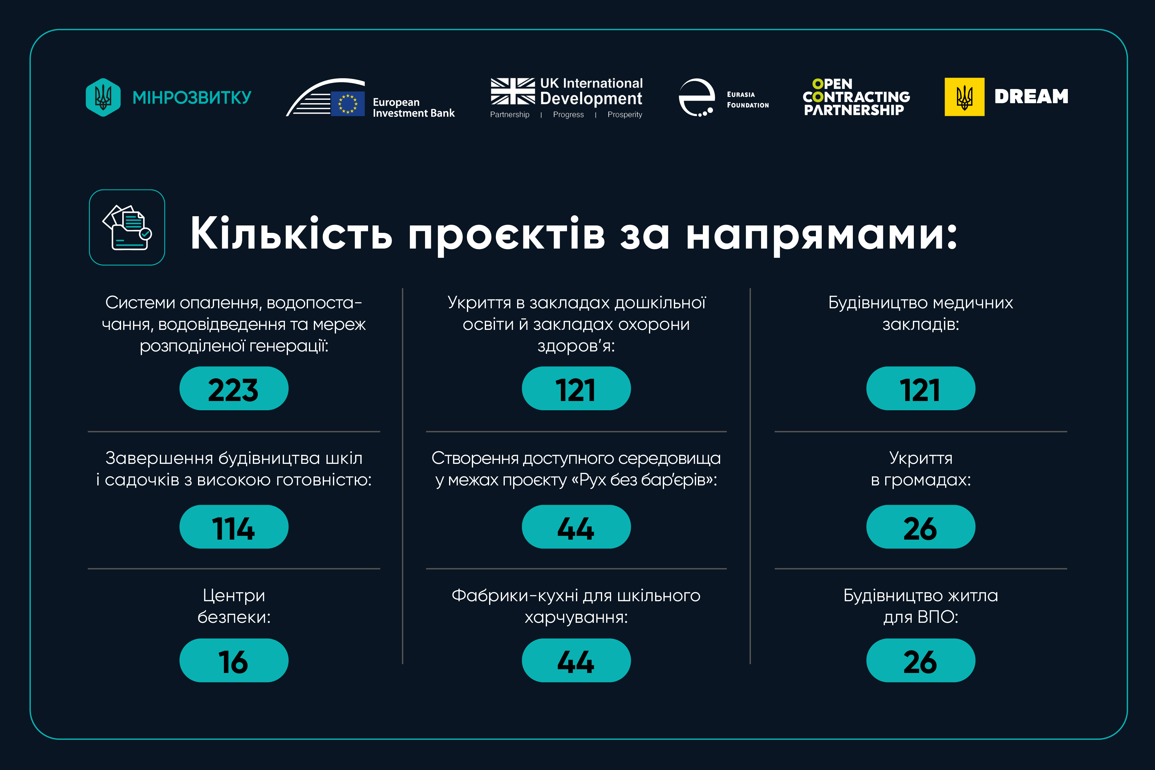 «Громади подали майже 700 заявок на фінансування проєктів з відновлення, це свідчить про високу потребу та активну позицію місцевого самоврядування. Наш пріоритет — забезпечити відновлення критично важливої соціальної інфраструктури: лікарень, укриттів та систем життєзабезпечення, з особливою увагою до прифронтових громад. Завдяки співпраці з Європейським інвестиційним банком та ПРООН, а також використанню цифрової системи DREAM, ми гарантуємо прозорість розподілу коштів та ефективне інвестування у стійкість наших територій та кращі умови життя для людей», — зазначив заступник Міністра Олексій Рябикін.