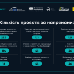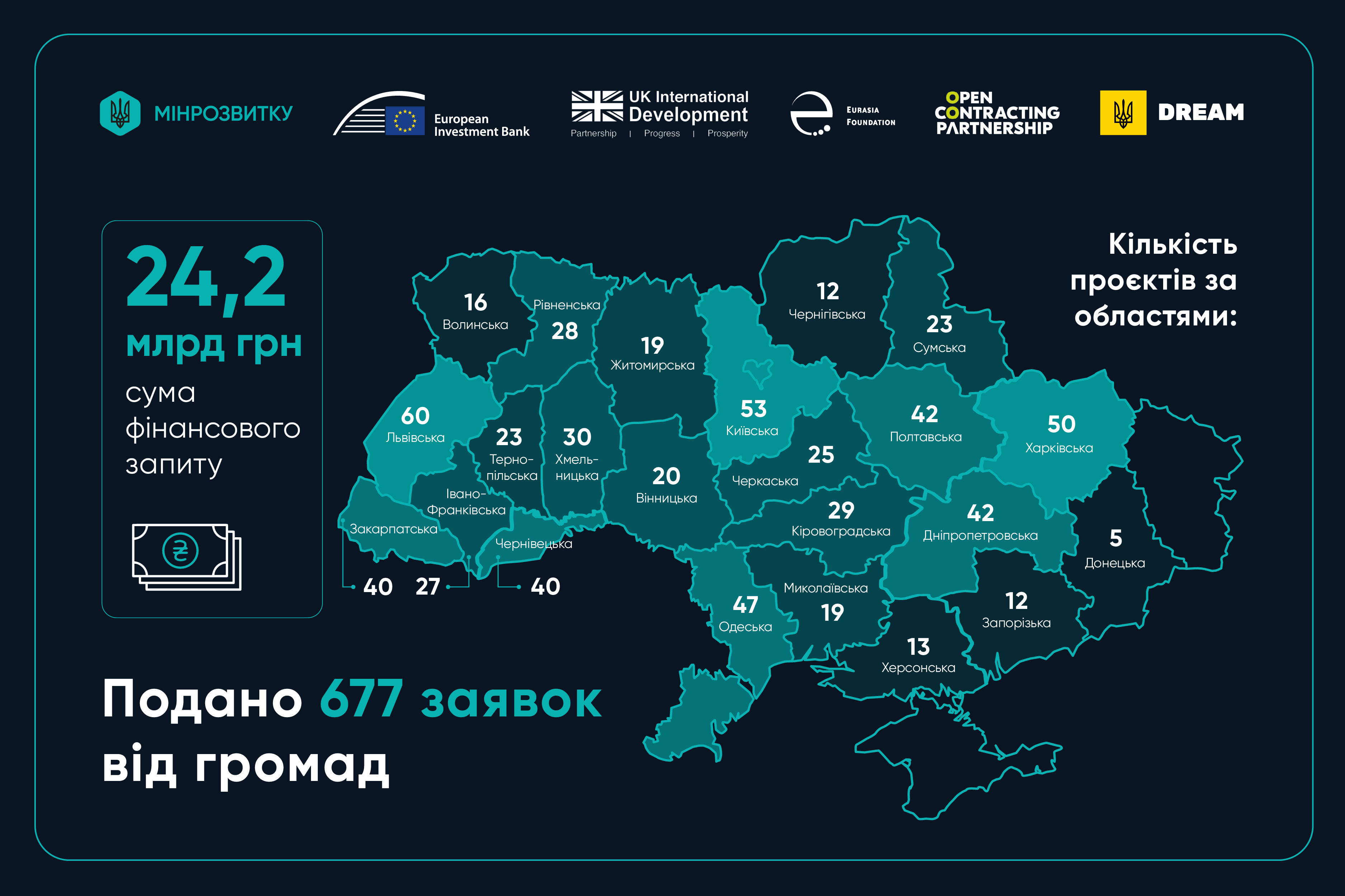 Заявки пройшли автоматичну пріоритезацію у системі DREAM відповідно до критеріїв програми. Лідерами за кількістю поданих заявок стали громади Львівської (60), Київської (53), Харківської (50) та Одеської (47) областей. Проєкти стосуються таких секторів: