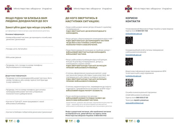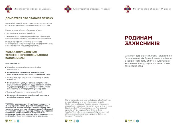 Міністерство оборони України у рамках інформаційної кампанії «Родинам захисників» розробило брошуру. Вона містить інформацію та поради, які знадобляться під час телефонного спілкування із захисниками та захисницями.