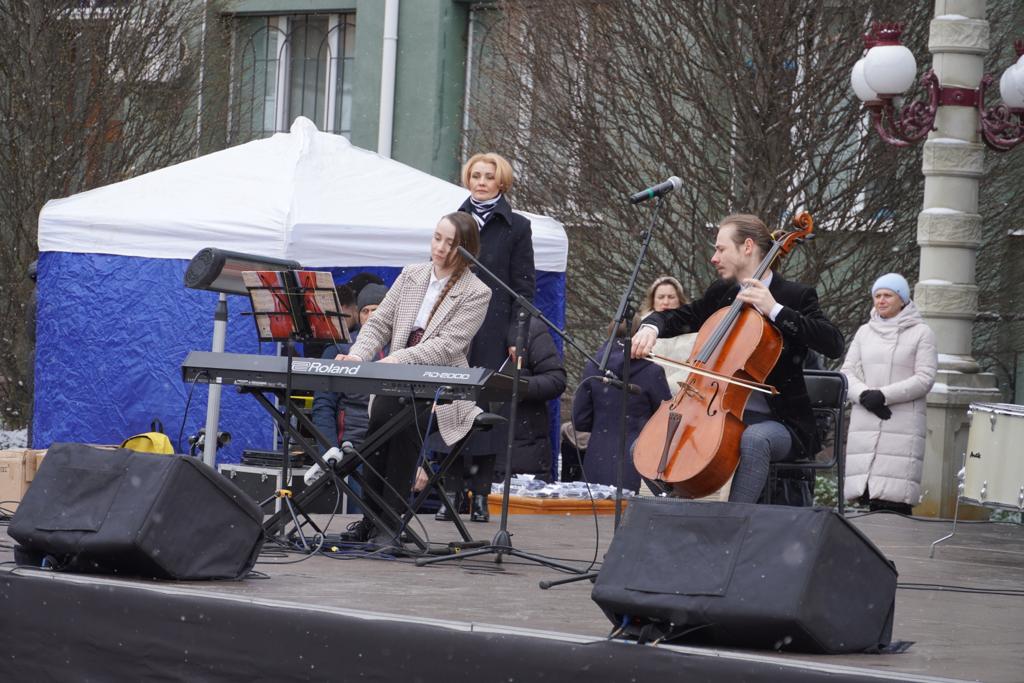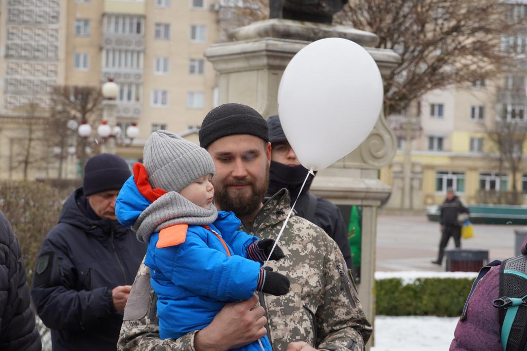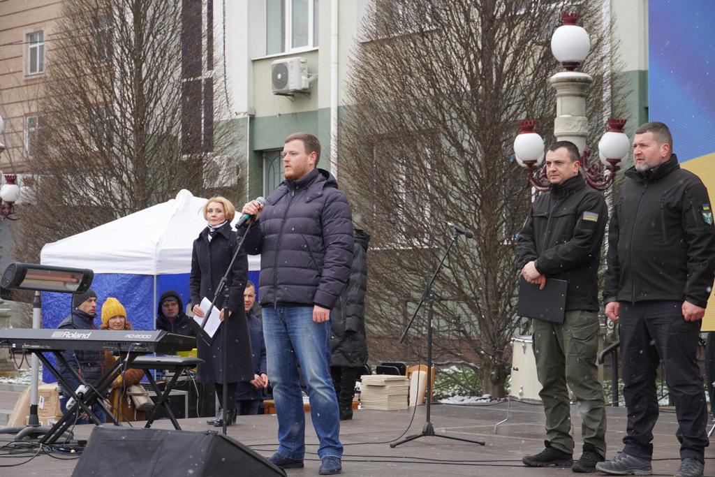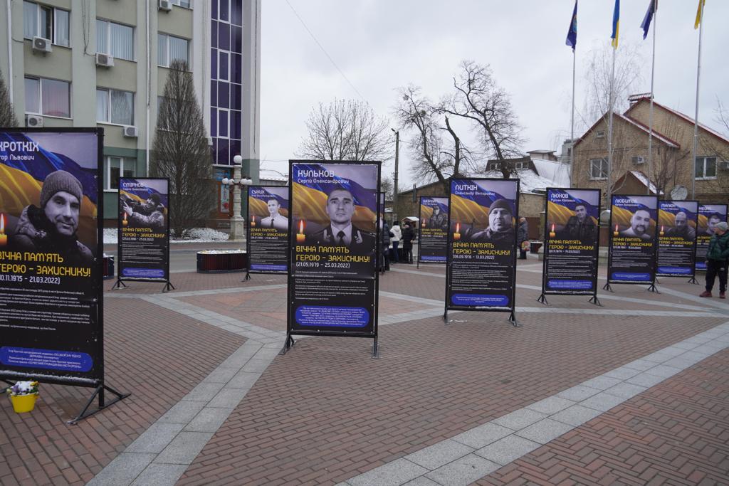 На площі встановили банери із зображеннями та біографіями загиблих героїв, які поклали свої життя, обороняючи місто. Присутні вшанували їхню пам’ять хвилиною мовчання. Крім того, учасникам показали на великому екрані відео, зняті оборонцями міста під час тих драматичних подій.