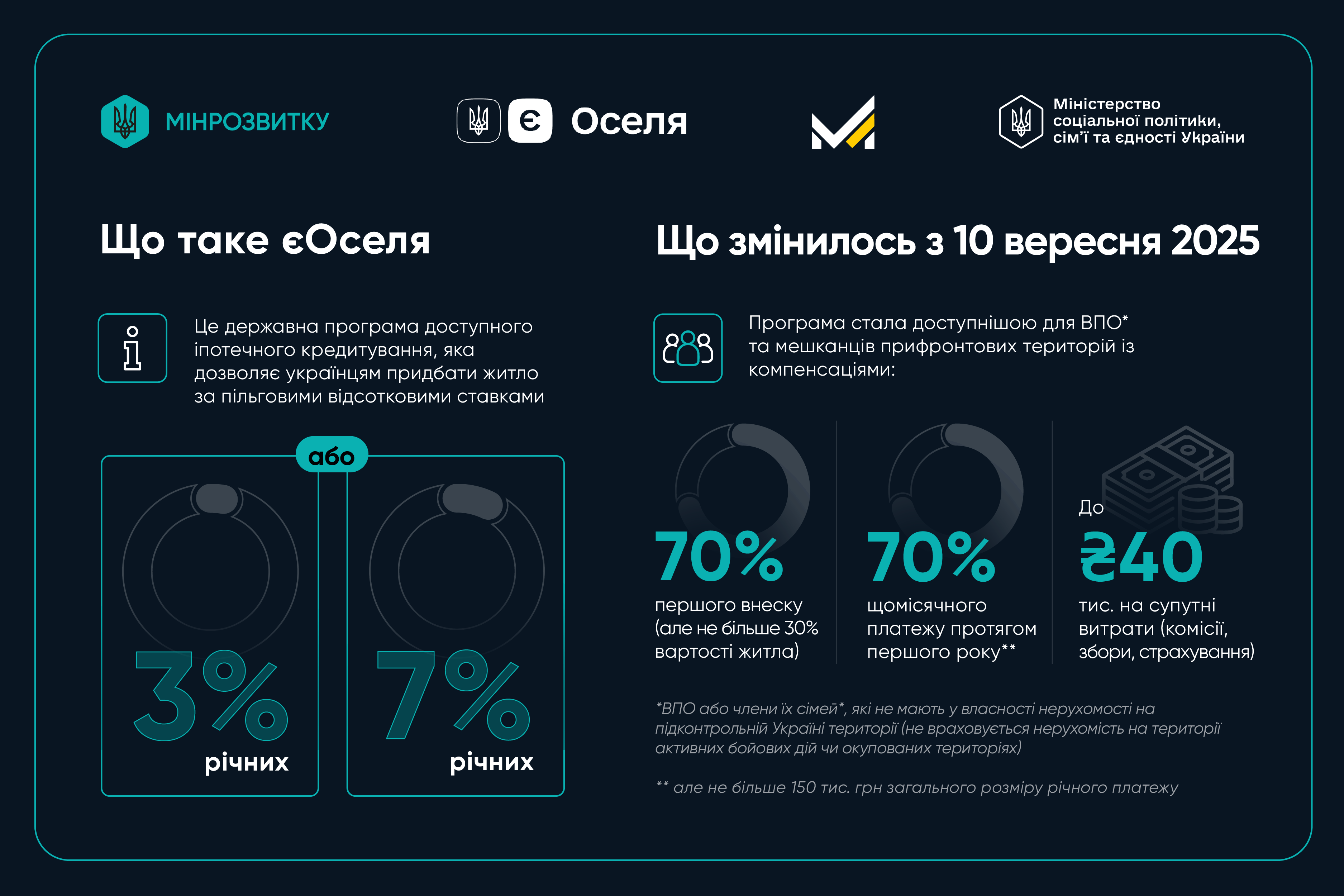Вже з сьогоднішнього дня, 10 вересня 2025 року, в рамках комплексної програми підтримки прифронтових регіонів, запрацює оновлений механізм підтримки програми єОселя. Йдеться про компенсації від держави для ВПО та мешканців прифронтових регіонів.